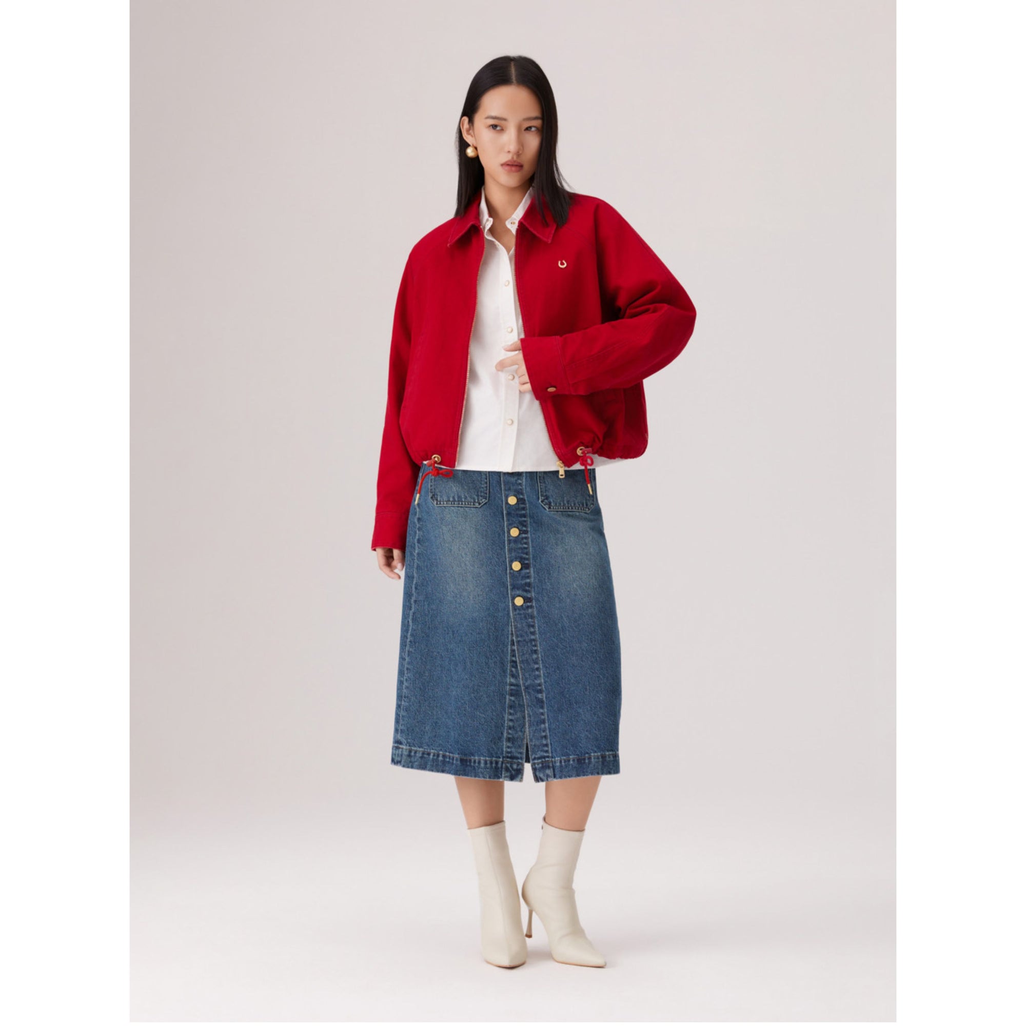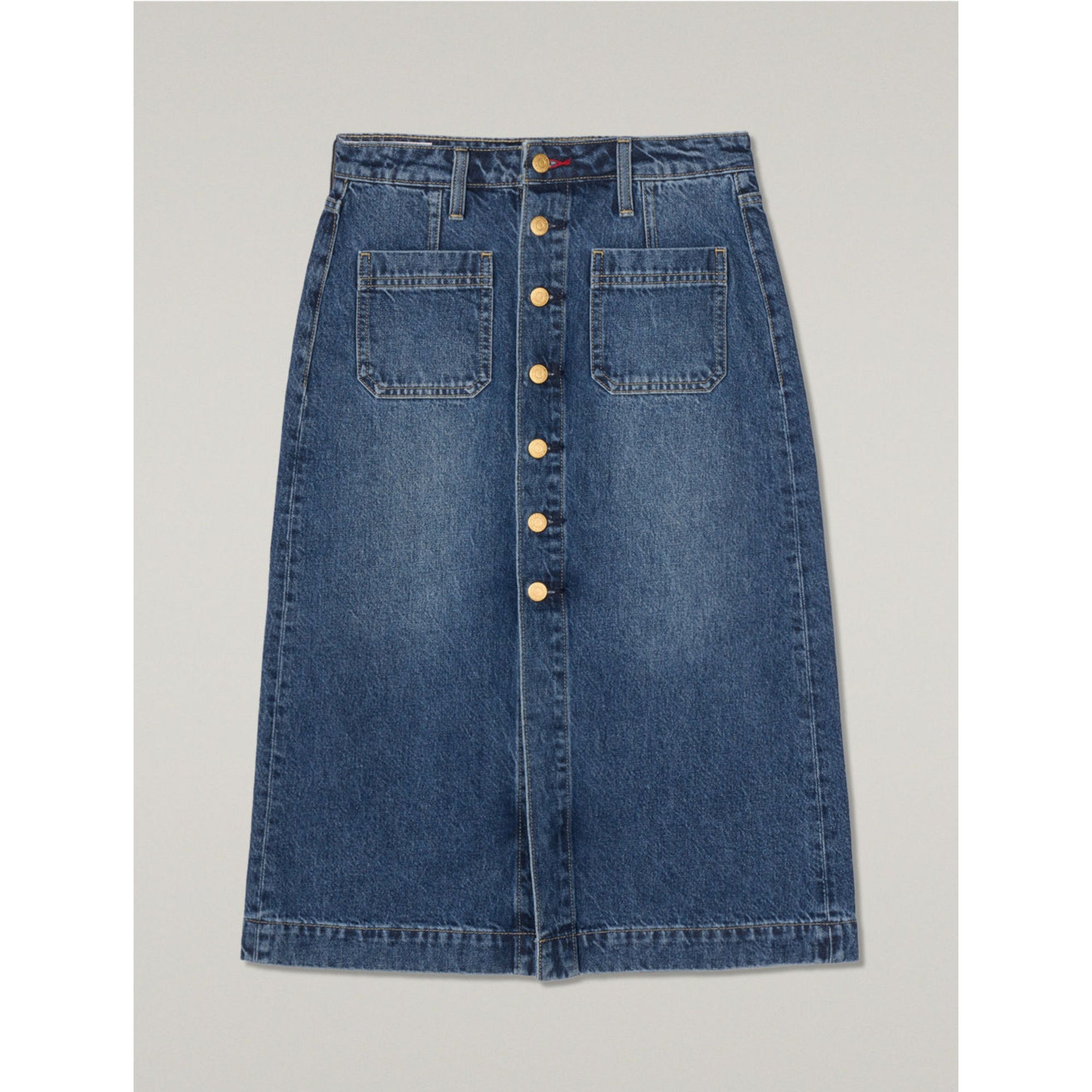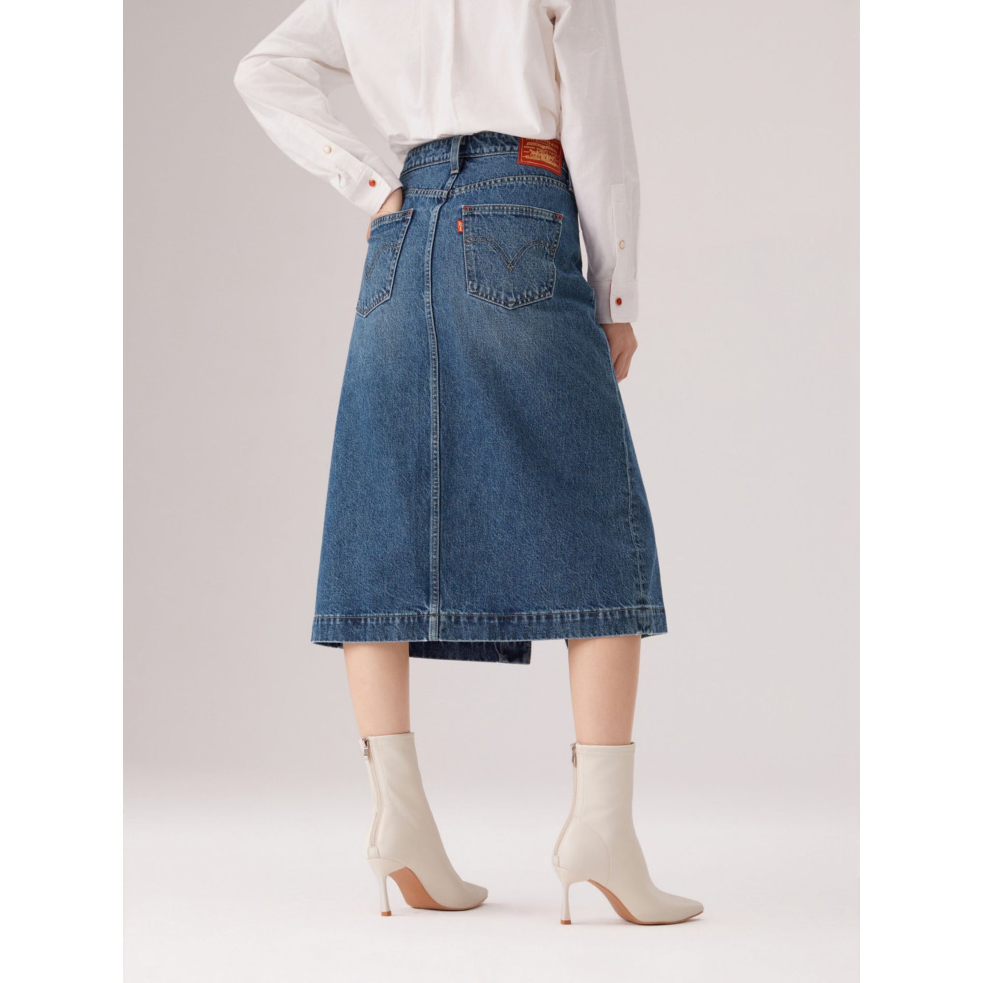 Levi's® 鈕扣前開叉牛仔短裙,經典A字版型,中腰中長,俐落鈕扣設計,融合做舊細節,輕鬆展現個性。