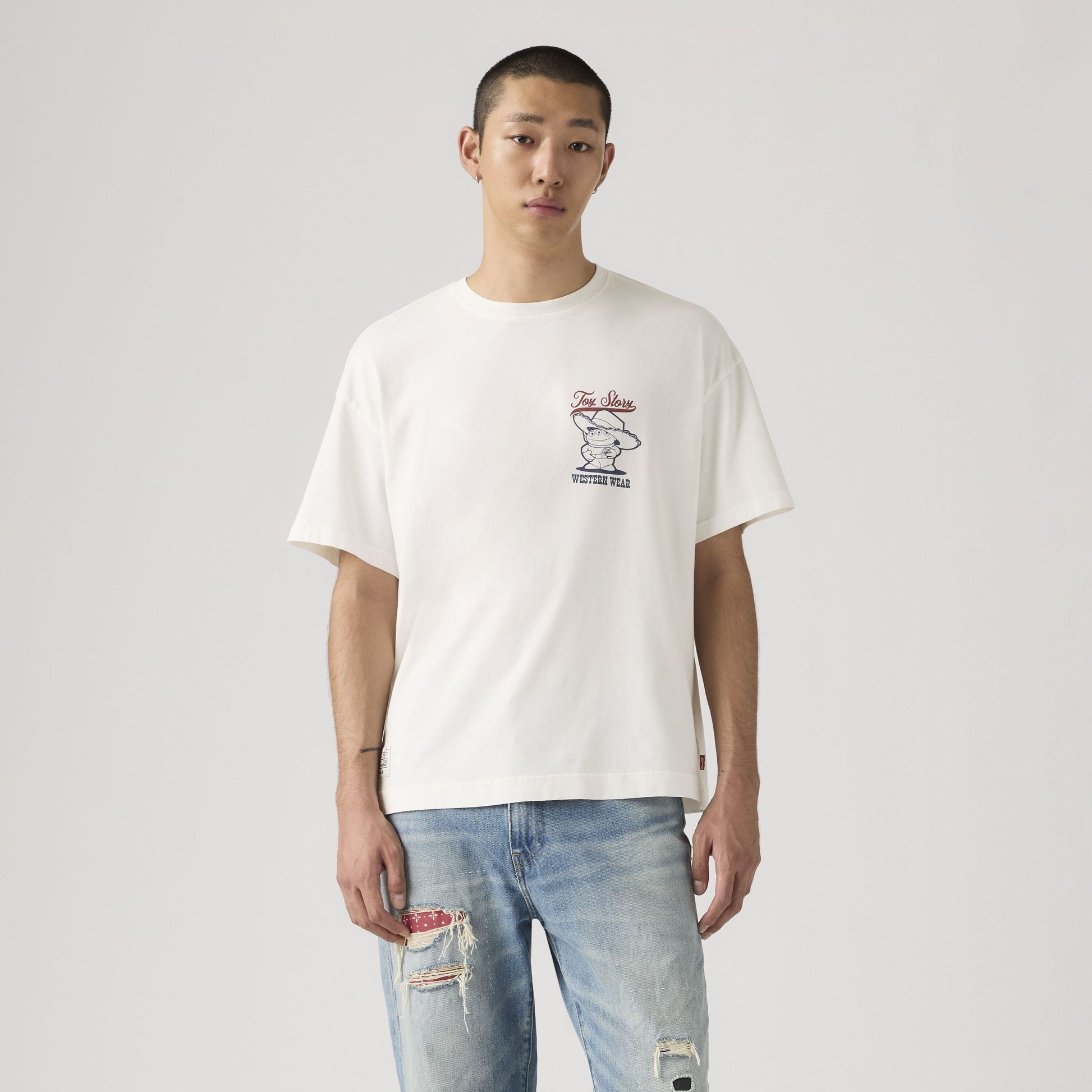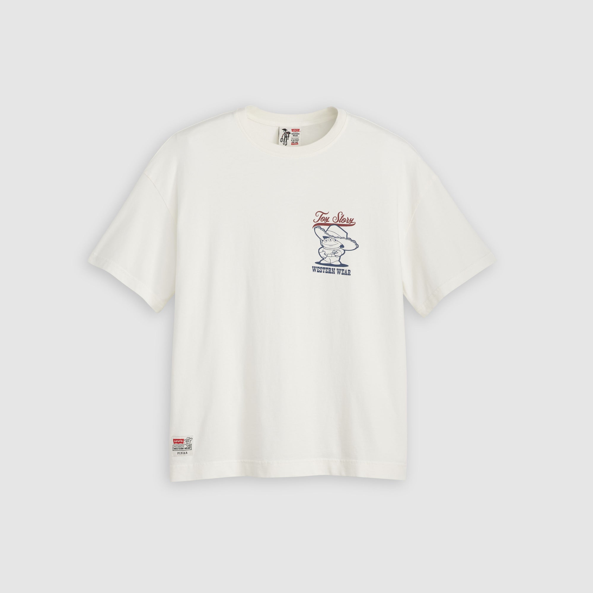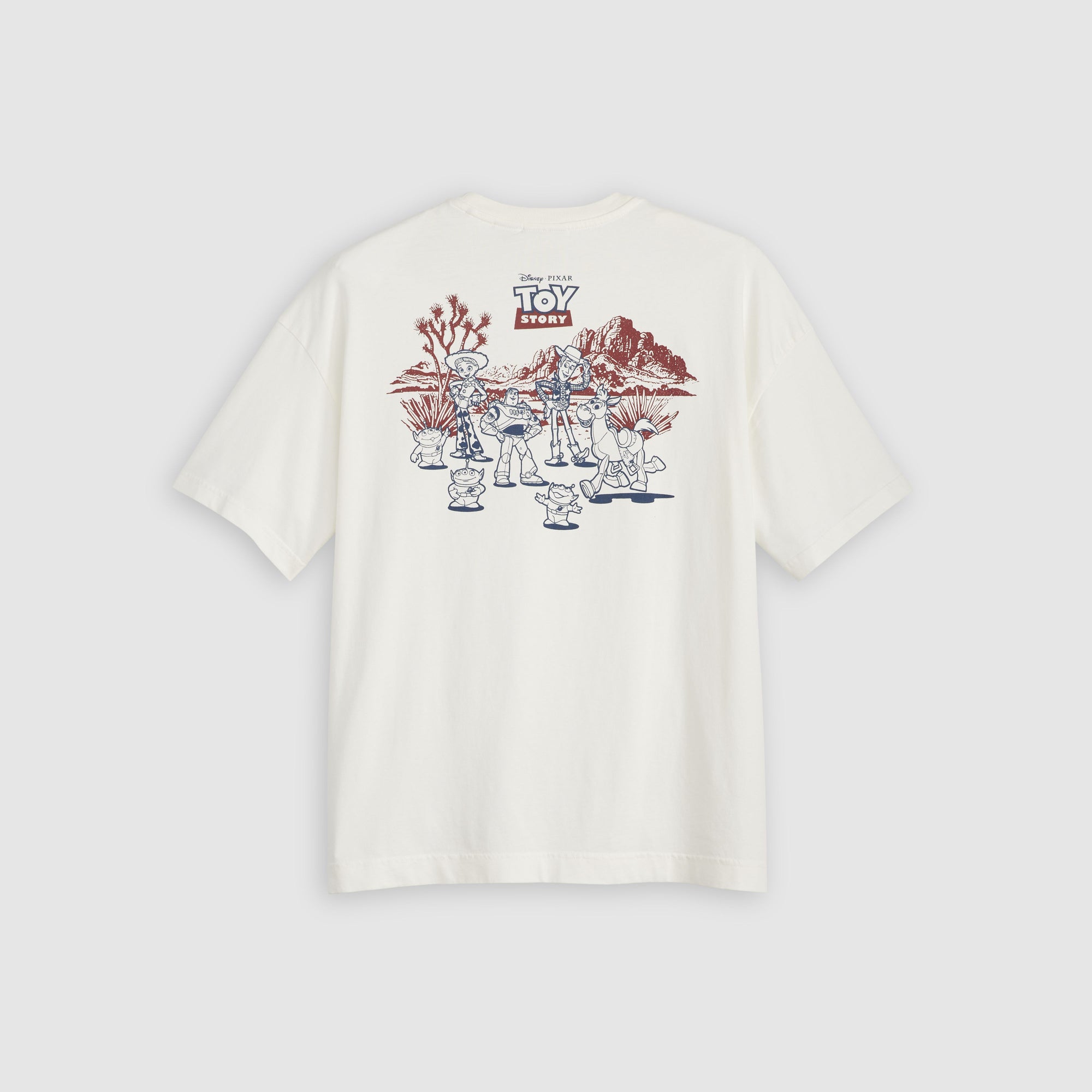 以復古水洗工藝打造,這款限量版寬鬆T恤飾有戴著牛仔帽的經典外星人角色與「Toy Story」字樣,背面呈現喜愛角色於西部景觀中的圖案,輕鬆展現俏皮與懷舊風情。